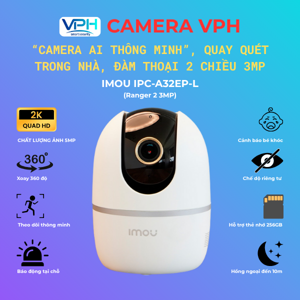 IMOU IPC-A32EP-L Ranger 2 3MP là camera WiFi trong nhà đáng tin cậy, hình ảnh rõ nét, quay quét linh hoạt và đàm thoại tiện lợi.