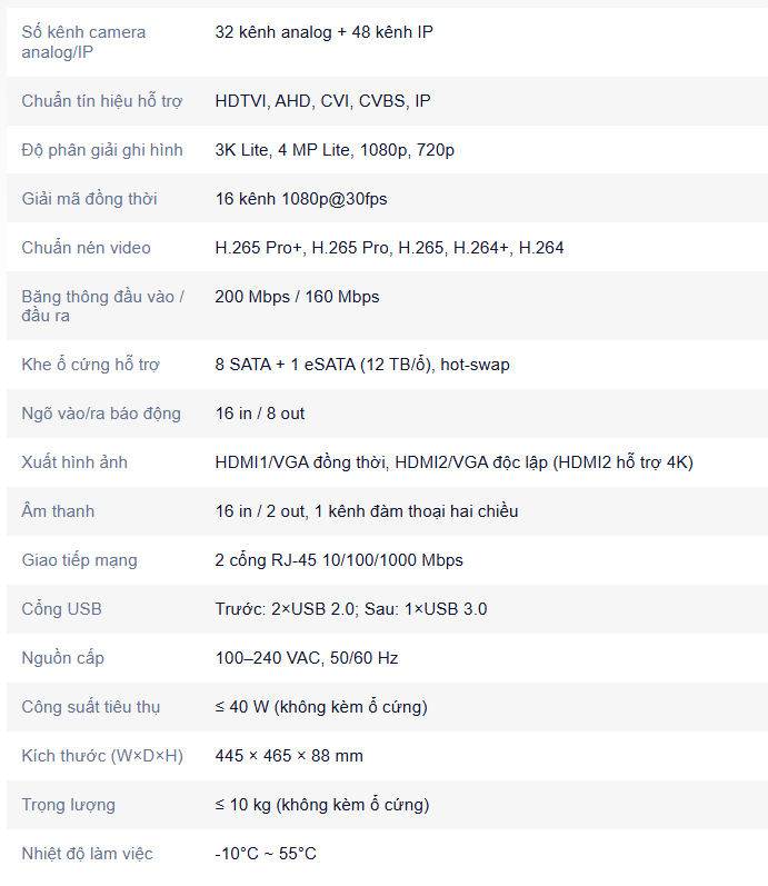 - Băng thông đầu vào 200 Mbps, băng thông đầu ra 160 Mbps, bảo đảm ghi hình ổn định khi kết hợp nhiều loại camera.